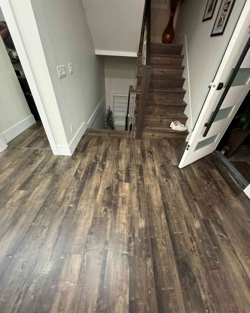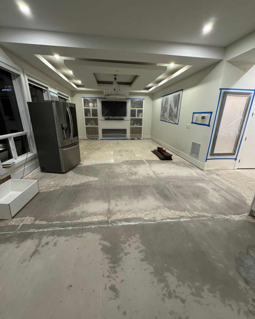 This project demonstrates a complete recovery from hidden kitchen water damage. What began as a small leak behind a refrigerator resulted in full flooring replacement across the home.
