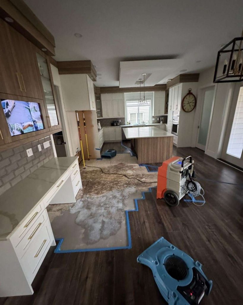 This project in Vancouver was caused by a broken water line extension behind the refrigerator, which led to significant water damage throughout the kitchen and surrounding areas.